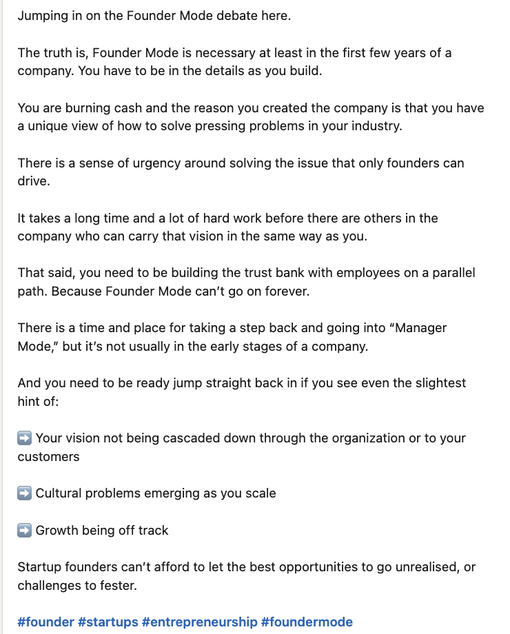 For example, Airbnb’s co-founder and CEO dished out an interesting opinion on a podcast, which the Internet called “founder mode.” The term, and the idea behind it, exploded overnight and we worked with clients to quickly share their thoughts on founder mode: