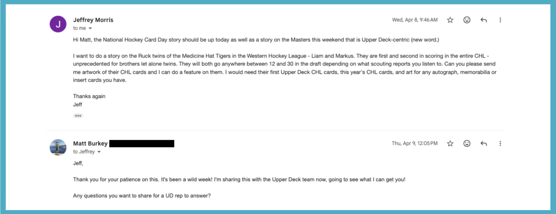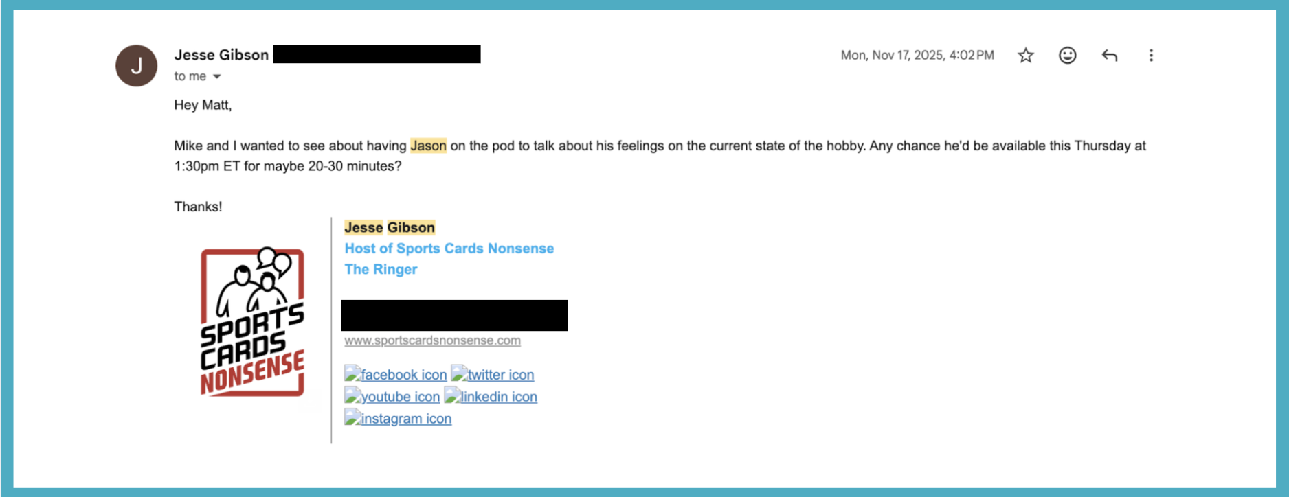 Will we matter in this story? Having a client quote or product mention in an article isn’t a bad thing, but when they are a primary focus, that makes it even better! When the Sports Card Nonsense podcast reached out we knew that it would be a high-visibility opportunity for our client because we’d worked with them several times in the past. Not only was the executive going to be able to hit key business messages, but also showcase their knowledge on the collectibles industry as a whole. This made it a no-brainer for us to pursue as soon as the opportunity came in.